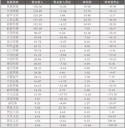 果麦文化紧随其后,以33.14%的增幅位列第三。其余多家公司增幅普遍较上年收窄,承压明显。与往年相比,今年第一季度同比增幅差距极大,呈现断档。长江传媒、新华传媒、内蒙新华、中文在线等11家公司增幅在10%以内。新经典、中文传媒、龙版传媒等14家公司第一季度营收同比下滑。其中,新经典下滑幅度最大,从其主要经营数据来看,该公司纸质图书、数字内容均呈现较大下滑,可能是过度依赖经典文学、产品结构单一,市场反应滞后,费用控制失效的结果。
