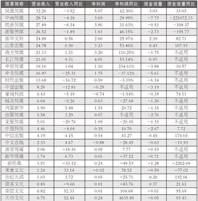在净利润方面,更是呈现“冰火两重天”的态势。28家上市书企中,第一季度净利润最高的依然为凤凰传媒,为5.07亿元,同比增加42.30%。净利润超过2亿元的还有6家,分别是长江传媒、皖新传媒、中南传媒、山东出版、南方传媒、新华文轩;中文传媒、浙版传媒、内蒙新华、中原传媒、龙版传媒5家公司净利润在1亿~2亿元之间。这些公司均为省级体量,通过“教材发行+多元业务”双轮驱动,抗风险能力强,另有叠加政府补助,体现规模效应与成本管控优势。
