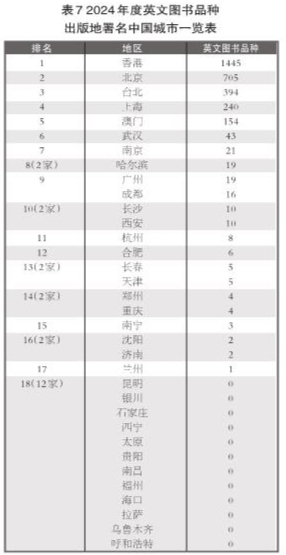 通过表6、表7可以发现,中国出版机构2024年度英文出版情况与往年相比,品种数量增加明显,但海外图书馆永久收藏品种数大幅下滑,这反映出中国出版机构的英文出版物在质量和吸引力上仍有待提升。表6数据则表明,虽然一些大城市如上海、澳门、武汉等地的出版机构在英文出版方面表现突出,但仍有大量城市的出版机构未能进入世界图书馆系统,这表明中国出版机构的国际影响力存在地域不平衡的问题。因此,中国出版机构(不含港澳台)仍需提升国际出版能力。对此,本报告特别提出两点建议。