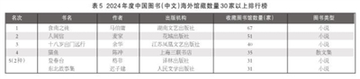 自2000年以来,中国当代文学类图书一直是海外图书馆重点收藏的品种。与往年相同,本报告将收藏该类图书的图书馆数量达到30家作为最低评选标准,据此评选出2024年度海外馆藏影响力最大的中文图书榜单(见表5)。
