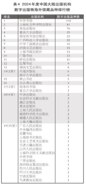 通过表4可以发现,共有42家出版机构的数字出版物进入海外馆藏,2024年度中国出版机构(不含港澳台)数字出版物海外馆藏数量排行榜前10位的出版社仍主要是大型的专业性出版社。中华书局排名第一,与上一年度相同。中华书局一如既往地关注数字出版,2024年度以104种进入海外馆藏,比第二名多23种。纵观中华书局进入馆藏的图书,其主题丰富,涵盖历史、文学、哲学、艺术等多个学科领域,大部分书籍具有较强的学术研究性,如《美华书馆:档案如是说》《殷墟甲骨岁祭研究》《南宋馆阁与文学研究》等,中华书局的作者群体在学术界具有很强的影响力,如傅璇琮、阎崇年、启功等,这些都体现出中华书局在学术研究出版领域的深厚底蕴和独特眼光。
