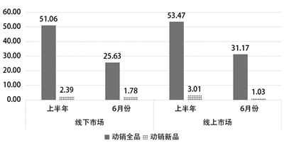 6月份,图书零售线下市场动销图书25.63万种,同比下降12.01%。其中,当年出版的新书动销17843种,同比下降14.36%;新书动销率为50.18%,同比下降0.36个百分点;新书的市场贡献率为15.33%,同比下降2.98个百分点。当月出版上市的新书动销1135种,同比增长27.67%;新品动销率为77.79%,同比提高38.78个百分点;当月新品的市场贡献率为2.70%,同比提高2.50个百分点。