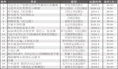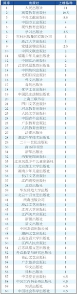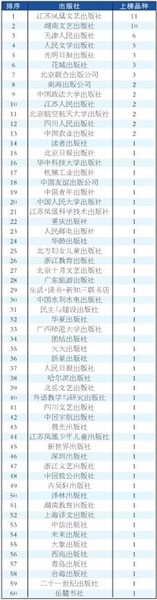 综合图书零售线下、线上市场两个热销TOP100,按出版社上榜书频次排列:江苏凤凰文艺出版社以12种(次),第三次蝉联第1位;湖南文艺出版社、人民出版社分别以11种(次),并列第2位;高等教育出版社以10.5种(次)列第3位。