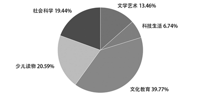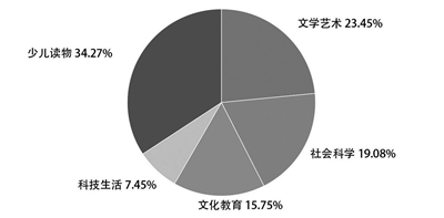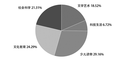 上半年,图书零售市场的销售结构(见2版图3)是:少儿读物类市场份额最大,占比29.16%,比重同比扩大1.42个百分点,较一季度扩大0.04个百分点;文化教育类市场份额次之,占比24.29%,比重同比扩大2.51个百分点,较一季度缩小1.73个百分点;社会科学类市场份额居中,占比21.31%,比重同比缩小2.72个百分点,较一季度扩大1.89个百分点;文学艺术类市场份额第四,占比18.52%,比重同比缩小0.91个百分点,较一季度缩小0.31个百分点;科技生活类市场份额最小,占比6.72%,比重同比缩小0.30个百分点,较一季度扩大0.11个百分点。(下转第2版) (上接第1版)