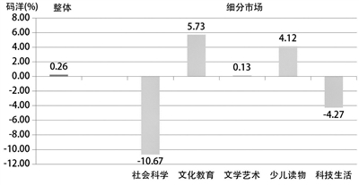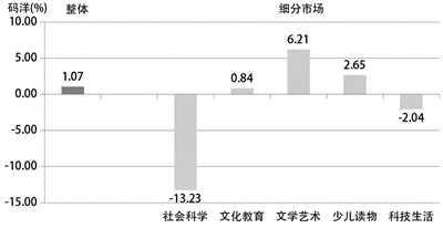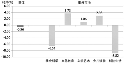 上半年,图书零售各细分市场规模增减不一(见2版图2)。三类细分市场规模扩大:文化教育书细分市场规模增幅较大,销售同比增长5.73%;少儿读物细分市场规模增幅次之,销售同比增长4.12%;文学艺术书细分市场规模微增,销售同比增长0.13%。两类细分市场规模缩小:社会科学书细分市场规模两位数降幅,销售同比下降10.67%;科技生活书细分市场规模一位数降幅,销售同比下降4.27%。