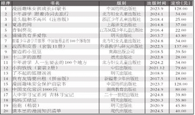 少儿读物热销品17个品种晋入全品类图书热销TOP100(见2版表5),原创品以10个品种,且列居前3位,占得优势。颇受青睐的《漫画趣味女孩成长启蒙书》(中国纺织出版社),不仅斩获童书市场领衔书,还以高销量占得全品类图书热销第17位,创下少儿图书罕见的市场站位。同社出版堪称姊妹品的《漫画趣味安全保护启蒙书》,相伴晋入。北方妇女儿童出版社的3种少年游学读物《跟着诗词去旅行》《中国值得去的100个博物馆》《人一生要去的100个地方》联袂晋入,折射了当下的少年游学热。曹文轩的《青铜葵花》(江苏凤凰少年儿童出版社)和任溶溶的《没头脑和不高兴》(浙江少年儿童出版社)的携手晋入,显示了名家经典的不可替代地位。同为去年出版上市的《大中华寻宝记系列 吉林寻宝记》(二十一世纪出版社)和《中国文化常识1000问》(湖南教育出版社)出版时间相近,销售排位相邻,成为近期次新品的佼佼者。而《我有友情要出租》的晋入,再次诠释了新疆青少年出版社的市场贡献。