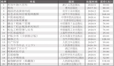 科技生活热销书虽然缺席全品类图书热销TOP100,但热销品类却超过其他细分市场(见2版表6)。3种科普读物《未知生物大百科》(浙江文艺出版社)、《香典》(重庆出版社)、《十万个为什么》(人民教育出版社)结伴晋入,前2种排位相邻,分列热销领衔位和榜眼位。《漫画讲透黄帝内经》(化学工业出版社)不仅销量列第3位,还携中国中医药出版社和上海科学技术社两个不同版本的《中医基础理论》,为中医读物在热销TOP20中占得3个席位。(下转第4版) (上接第3版)
