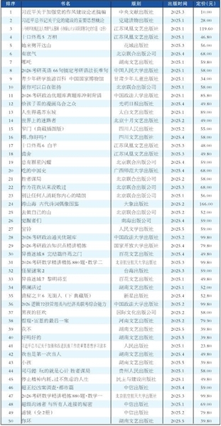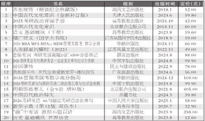 文化教育热销书12个品种晋入全品类图书热销TOP100(见2版表3)。长期驻榜的经典传记读物《苏东坡传》(湖南文艺出版社)斩获领衔书桂冠,并携另3种同类读物《人类群星闪耀时》(江苏凤凰文艺出版社)、《曾国藩传》(民主与建设出版社)、《我的前半生 末代皇帝爱新觉罗·溥仪自传》(广东旅游出版社),联袂晋入全品类图书热销TOP100,以领衔且三分之一的占比,显示了热销传记读物的市场站位。语言学大师王力主编的《中国古代文化常识》(北京联合出版公司)和天津人民出版社的《中国古代文化常识(全新补订版)》携手晋入,并与《增广贤文》(江苏凤凰科学技术出版社)一起,共同为中国传统文化读物在市场TOP100中占得席位。4种考研书《2025考研政治背诵手册》(高等教育出版社)、《2026管理类联考数学分册》(华龄出版社)、《2026恋练有词:考研英语真题词汇6500分层串记》(群言出版社)、《2026考研英语语法及长难句应试全攻略》(中国宇航出版社)的晋入,凸显了考试书的市场刚需。
